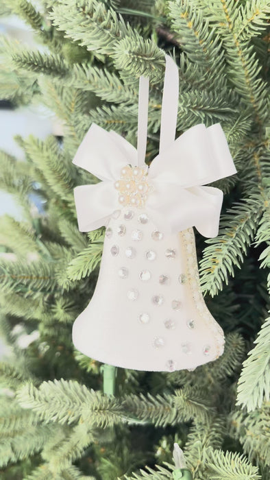 Add a touch of timeless elegance to your holiday décor with our handcrafted White Bell Ornament, a stunning piece that blends classic charm with luxurious detail. Made from shimmering white fabric and adorned with sparkling rhinestones and pearl accents, this bell-shaped ornament brings sophistication to any Christmas tree or festive setting.